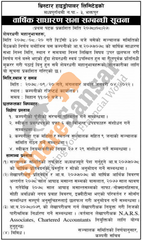 Three Star Hydropower Limited has announced its Annual General Meeting going to be held on 20th Poush, 2078.