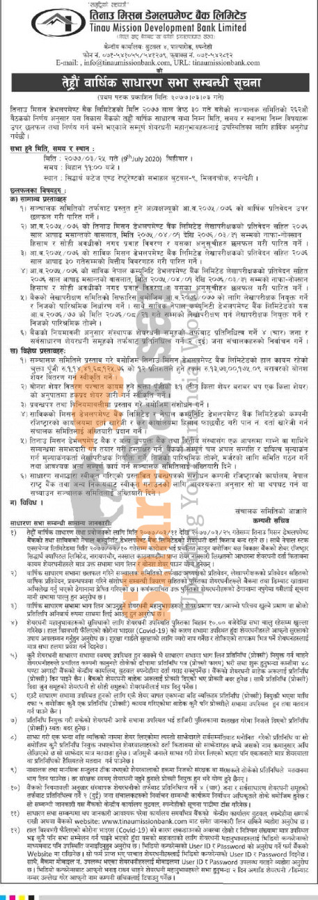 Tinau Mission Development Bank Limited has announced its 13th AGM going to be held on 25th Ashad, 2077.