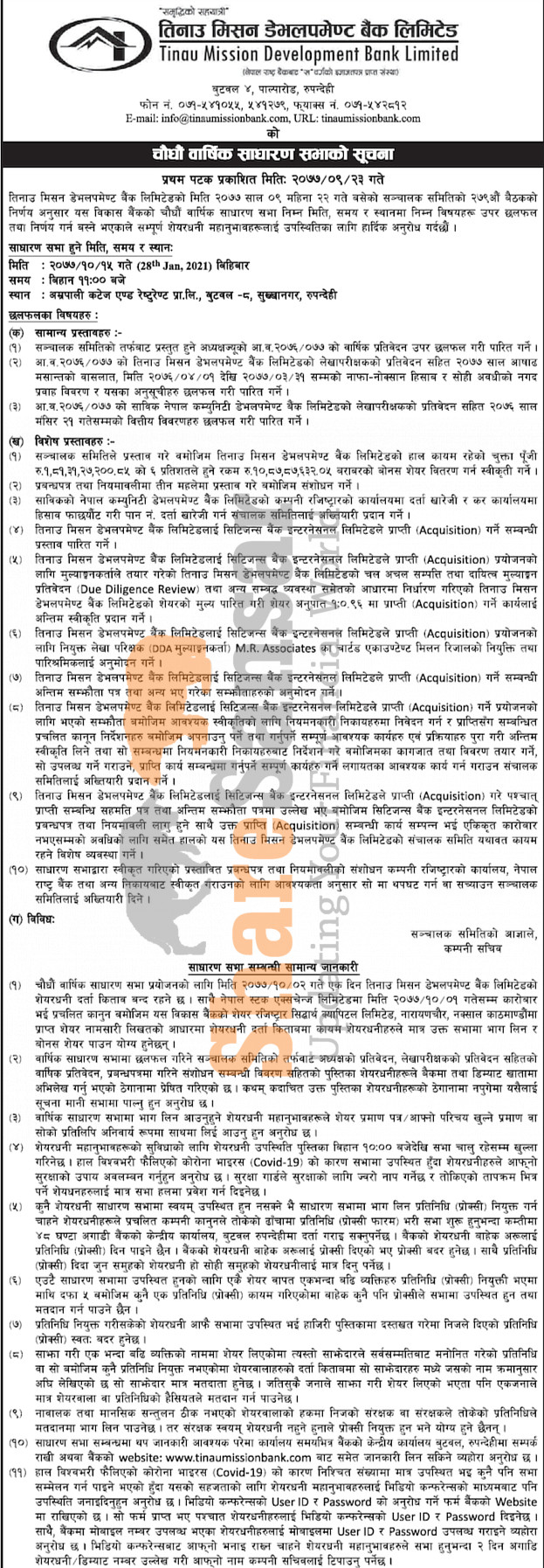 Tinau Mission development Bank Limited has announced its 14th AGM going to be held on 15th Magh, 2077.
