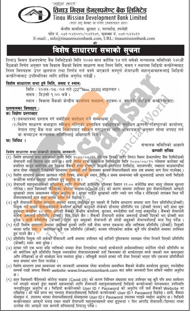 Tinau Mission Development Bank Limited has announced its Special General Meeting going to be held on 7th Mangsir, 2077.