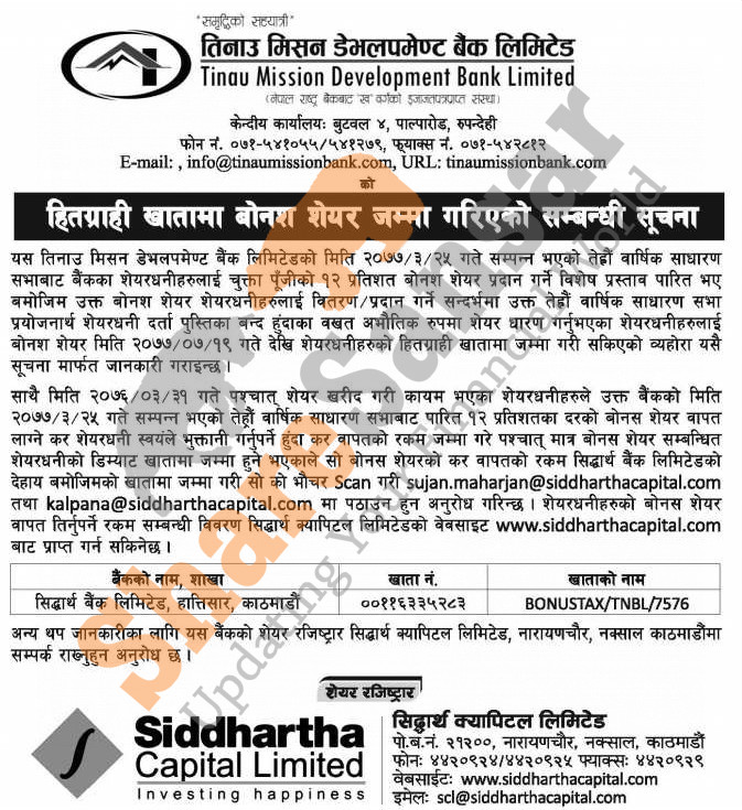 Tinau Mission Development Bank Limited is distributing 12% bonus share directly to DEMAT accounts and urged its shareholders to dematerialize their shares.