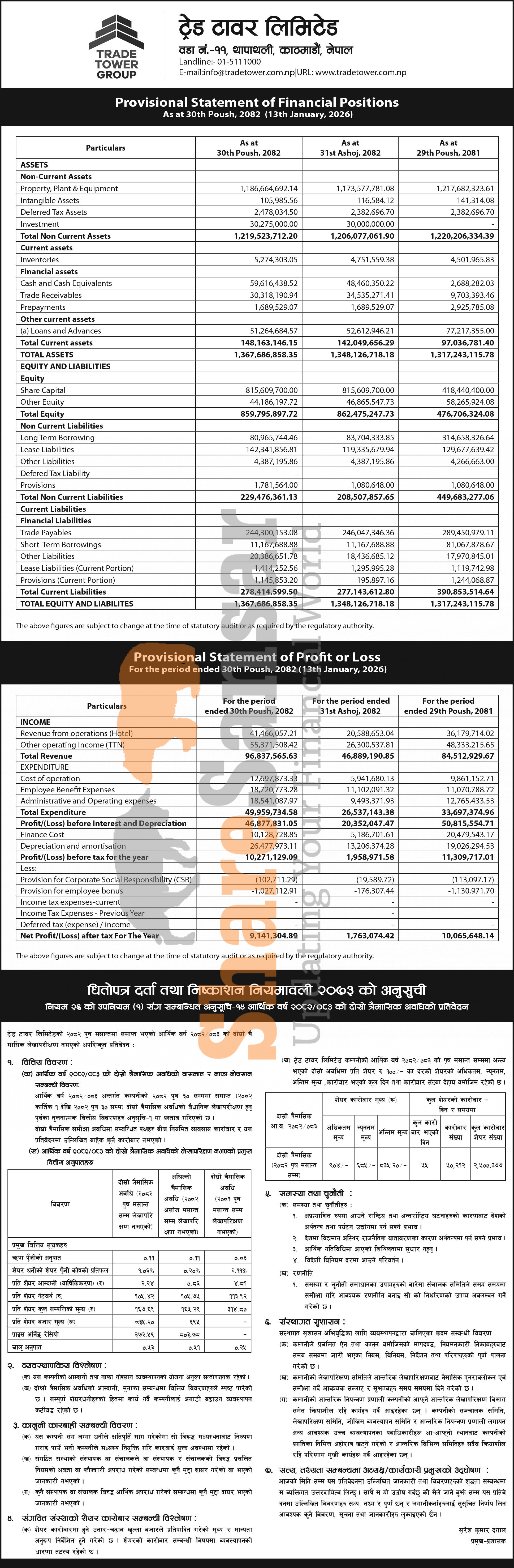 Trade Tower Limited has posted a net profit of Rs 9.14 million and published its 2nd quarter company analysis of the fiscal year 2082/83.
