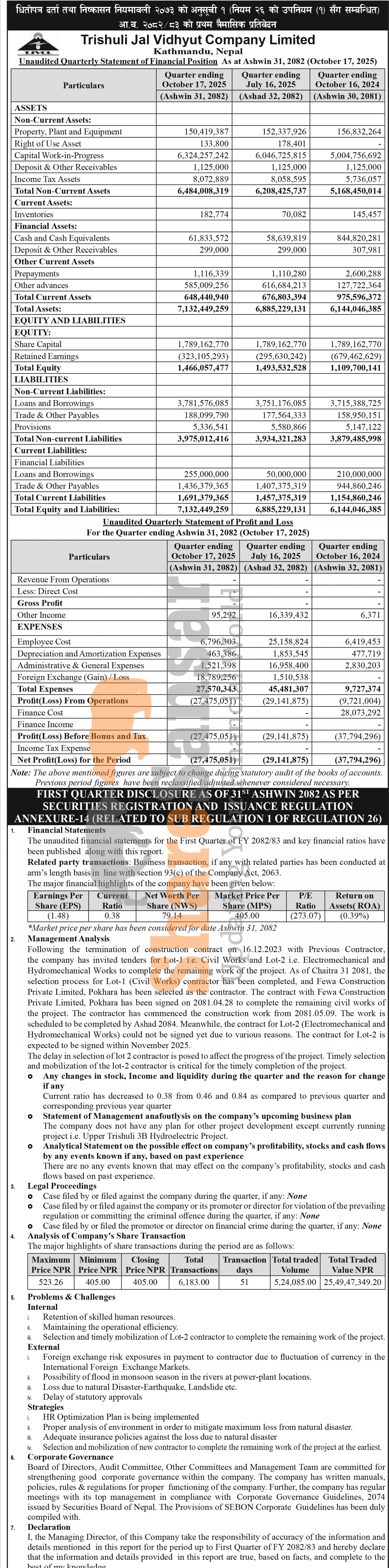 Trishuli Jal Vidhyut Company Limited has posted a net loss of Rs 27.47 million and published its 1st quarter company analysis of the fiscal year 2082/83.