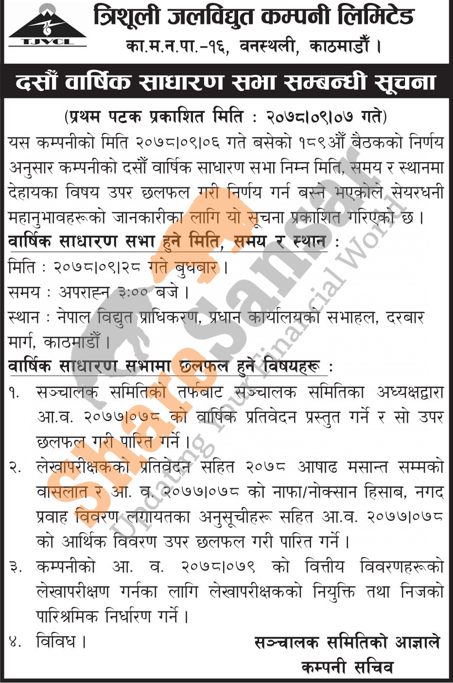 Trishuli Jalvidhyut Company Limited has announced its 10th AGM going to be held on 28th Poush, 2078.