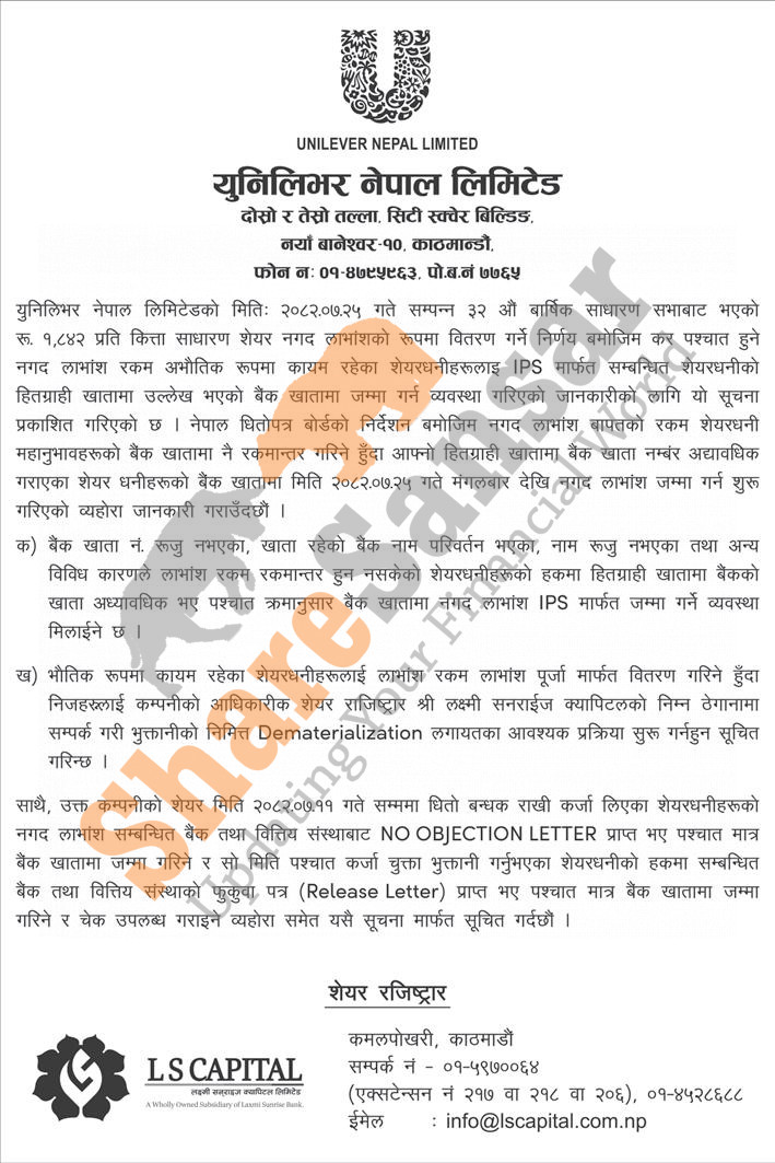 Unilever Nepal Limited has distributed 1842 per share cash dividend directly to the bank accounts of its shareholders on 25th Kartik, 2082 and has urged to dematerialize their shares.