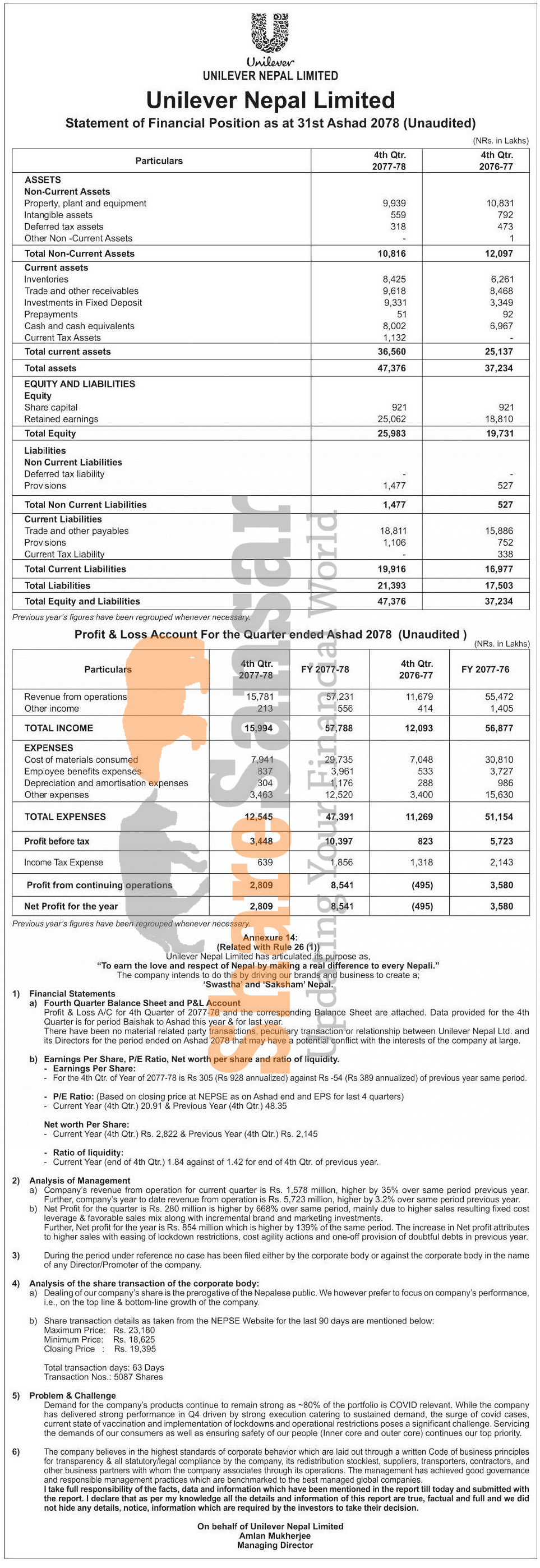 Unilever Nepal Limited has posted a net profit of Rs 854.1 million and published its 4th quarter company analysis of the fiscal year 2077/78.