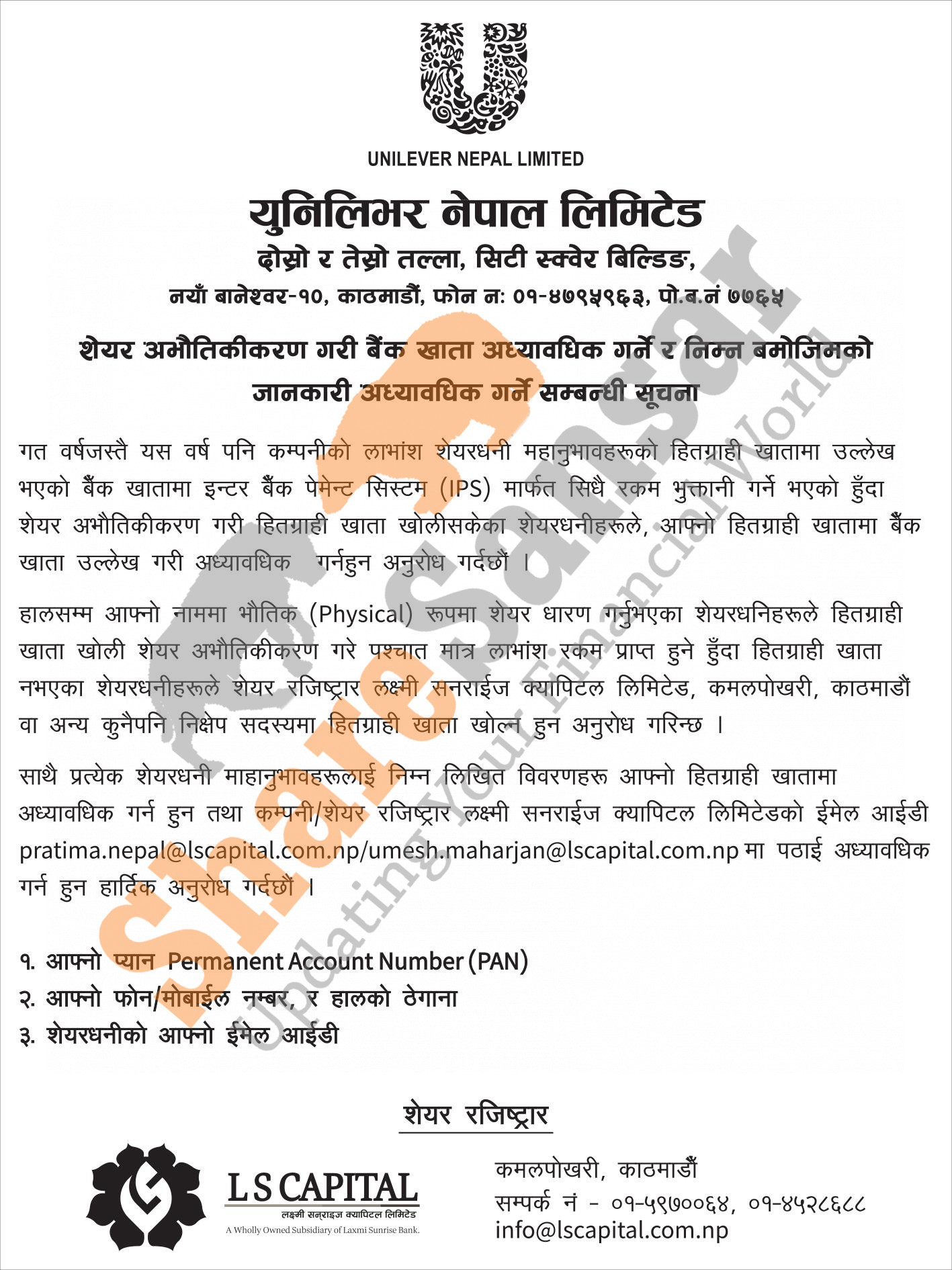 Unilever Nepal Limited has urged its account holders to update their Permanent Account Number (PAN) along with their account details.