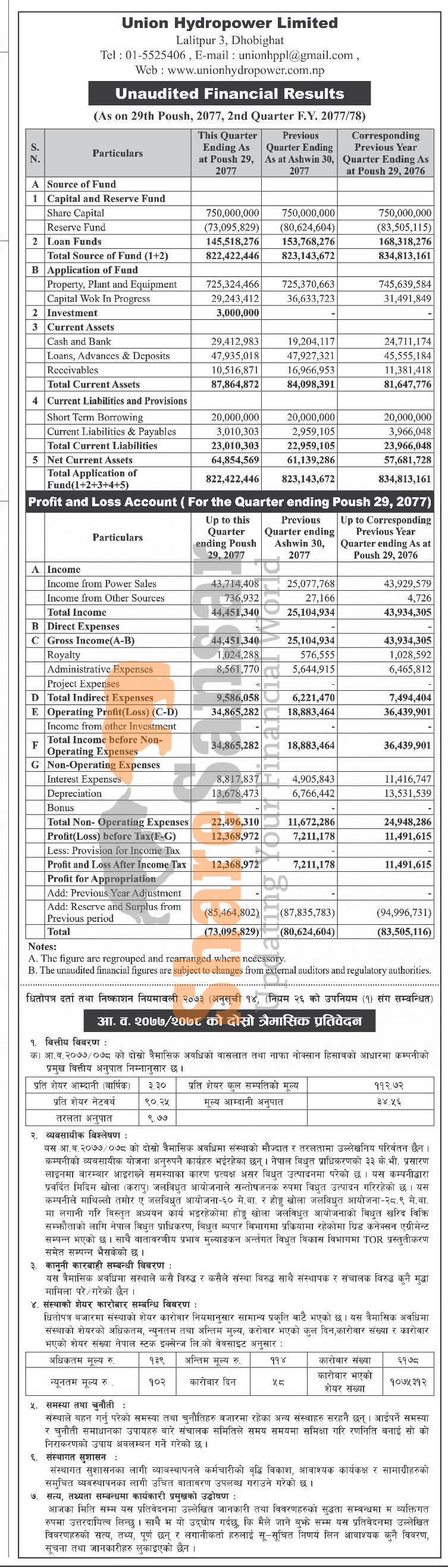 Union Hydropower Company Limited has posted a net profit of Rs 12.36 million and published its 2nd quarter company analysis of the fiscal year 2077/78.