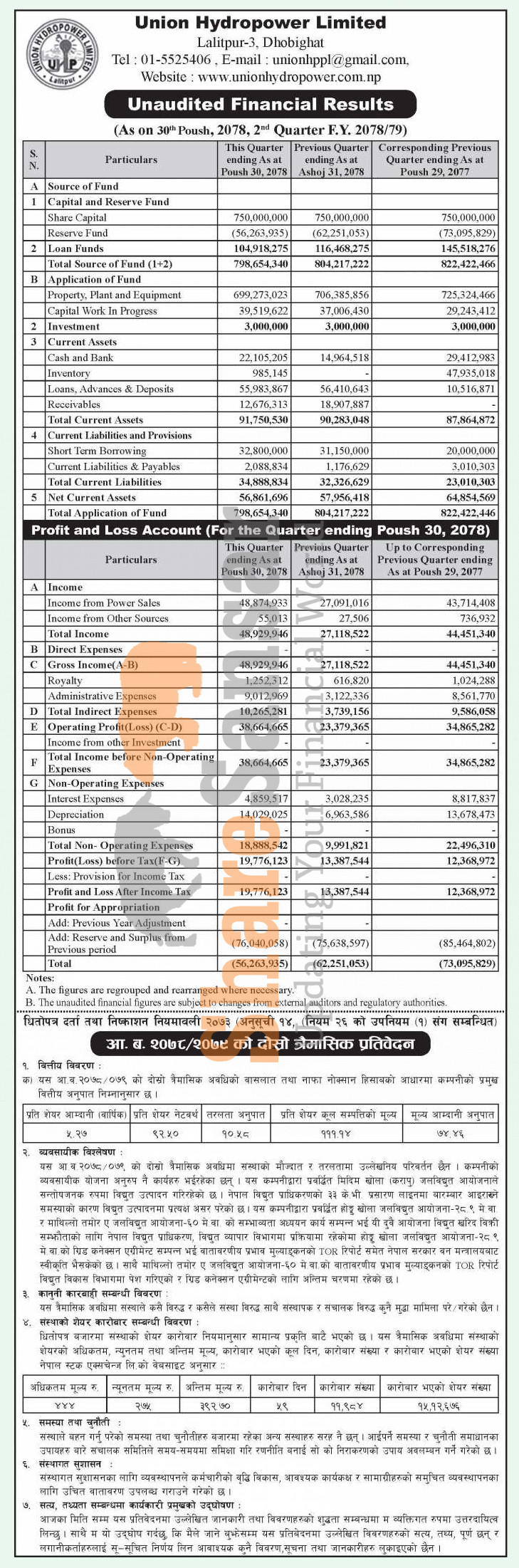 Union Hydropower Company Limited has posted a net profit of Rs 19.77 million and published its 2nd quarter company analysis of the fiscal year 2078/79.