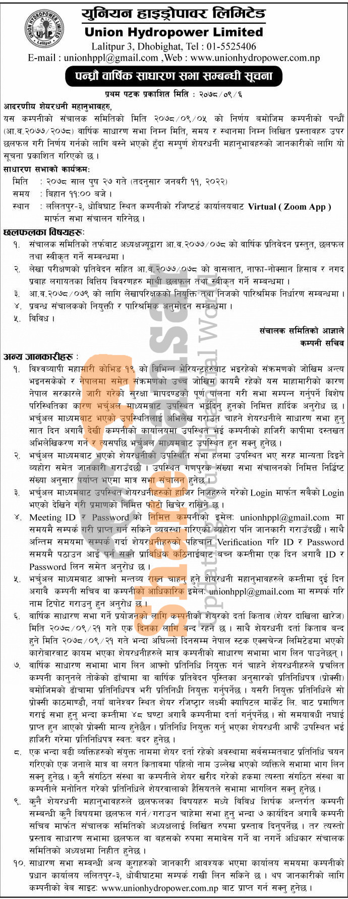 Union Hydropower Limited has announced its 15th AGM going to be held on 27th Poush, 2078.