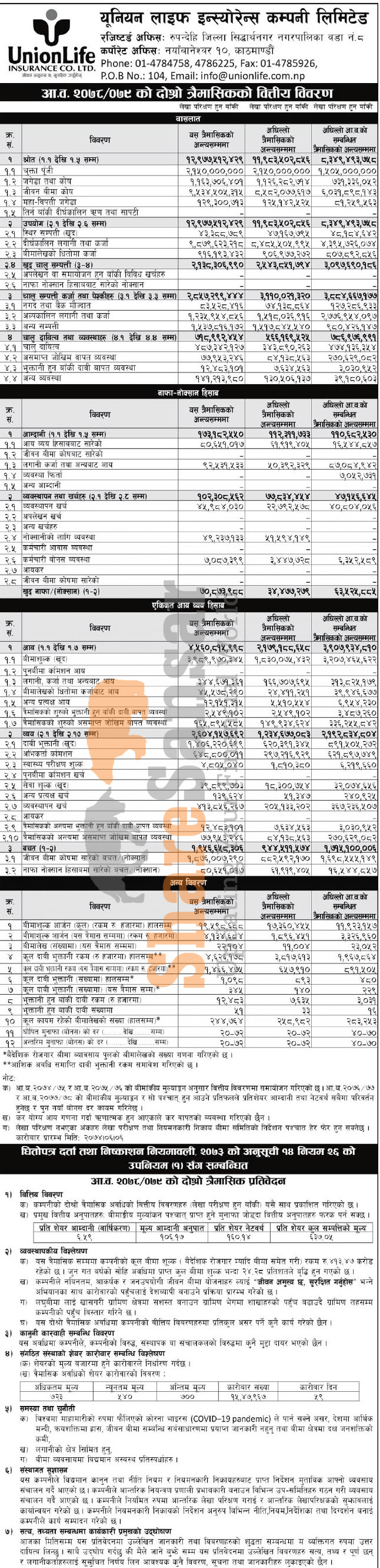 Union Life Insurance Company Limited has posted a net profit of Rs 70.87 million and published its 2nd quarter company analysis of the fiscal year 2078/79.