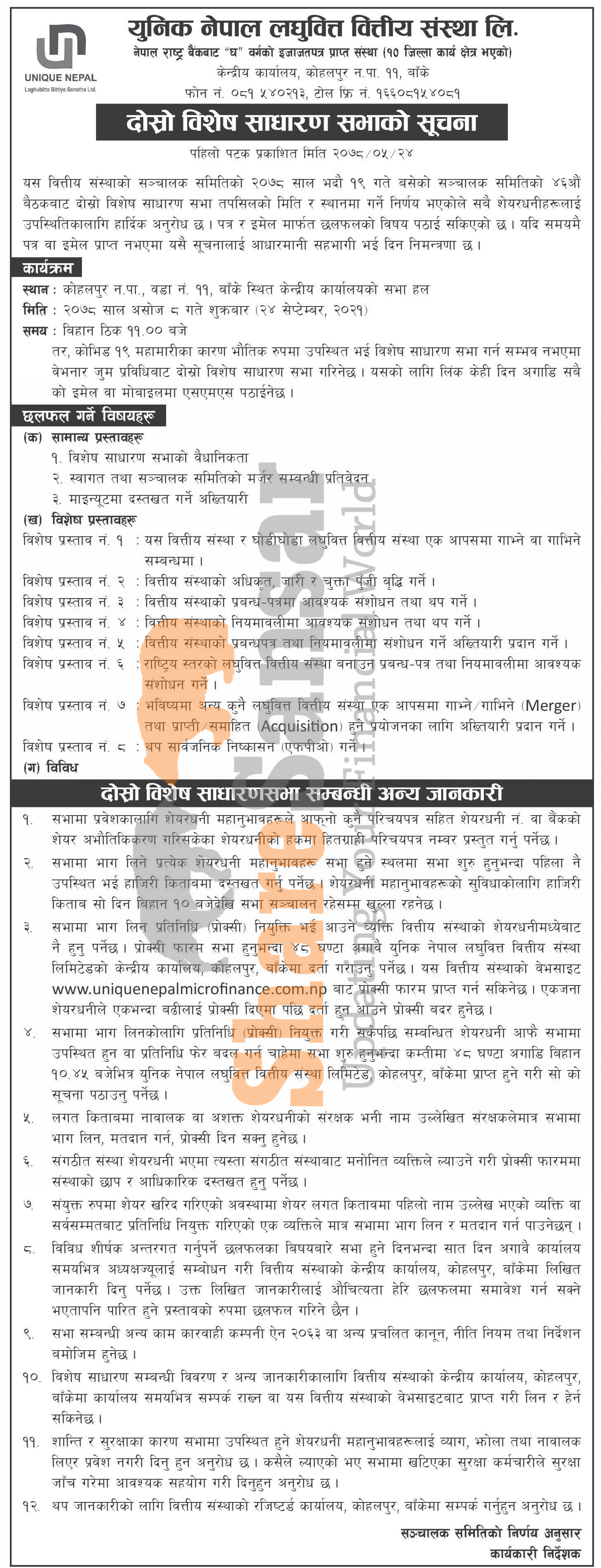 Unique Nepal Laghubitta Bittiya Sanstha Limited has announced its SGM going to be held on 8th Asoj, 2078.
