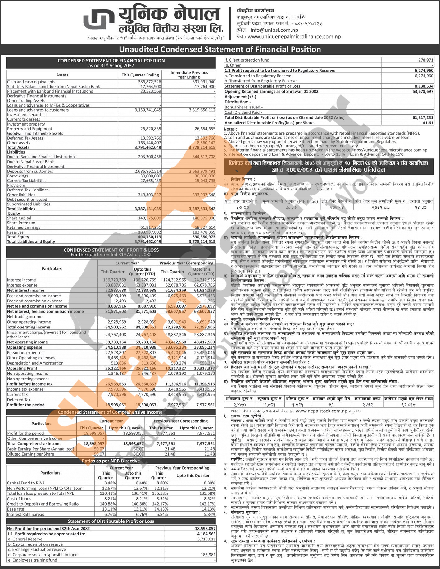 Unique Nepal Laghubitta Bittiya Sanstha Limited has posted a net profit of Rs 18.59 million and published its 1st quarter company analysis of the fiscal year 2082/83.