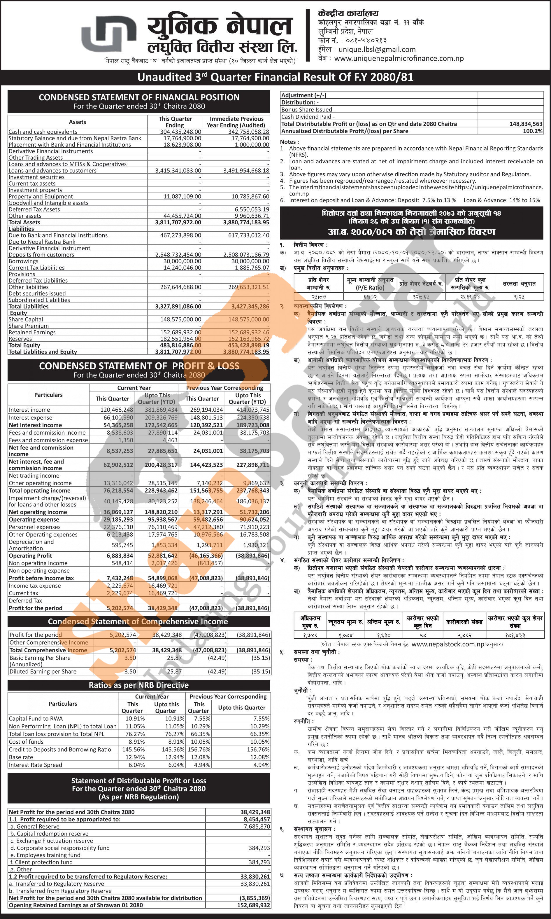 Unique Nepal Laghubitta Bittiya Sanstha Limited has posted a net profit of Rs 38.42 million and published its 3rd quarter company analysis of the fiscal year 2080/81.