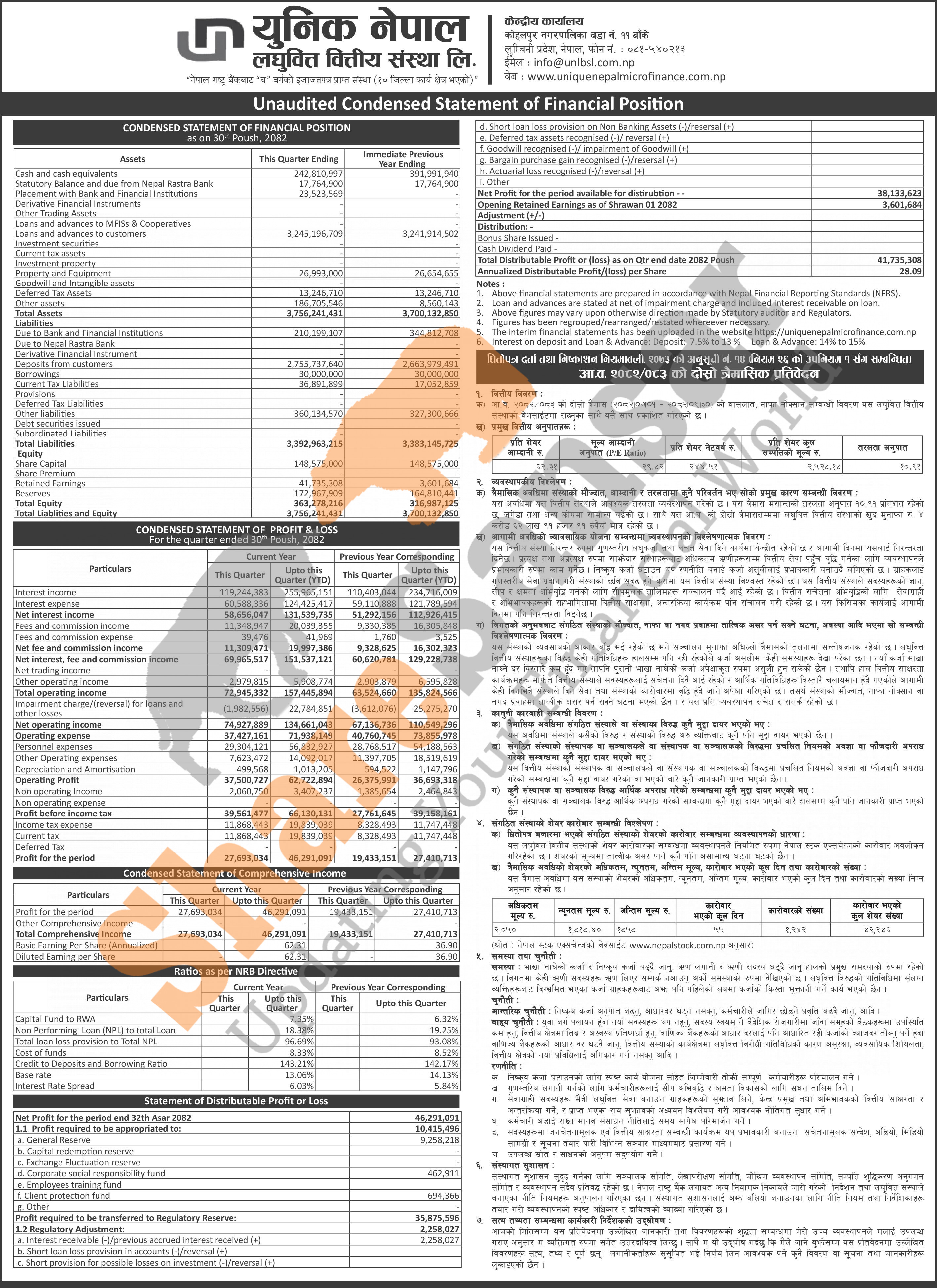 Unique Nepal Laghubitta Bittiya Sanstha Limited has posted a net profit of Rs 46.29 million and published its 2nd quarter company analysis of the fiscal year 2082/83.