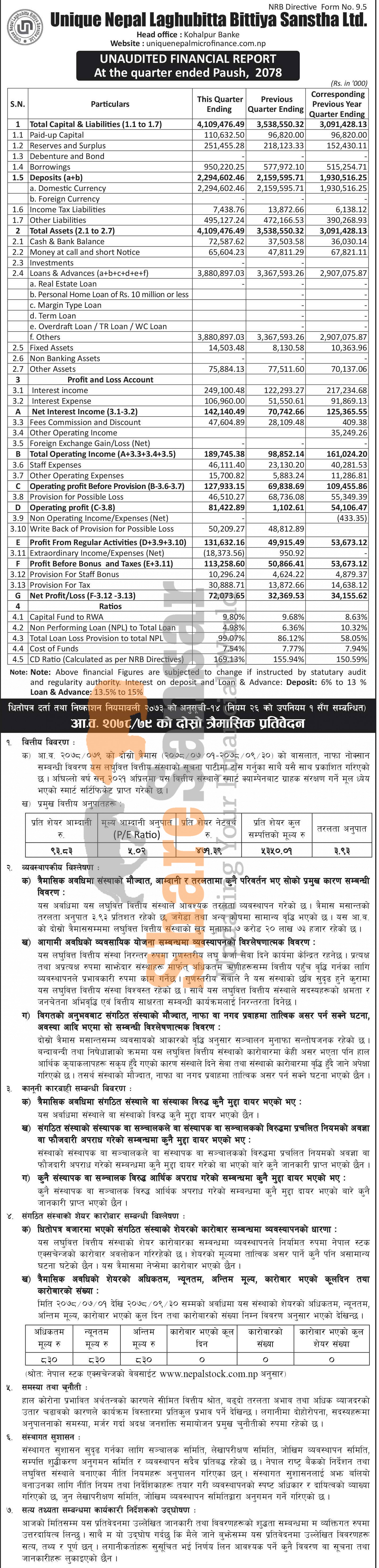 Unique Nepal Laghubitta Bittiya Sanstha Limited has posted a net profit of Rs 72.07 million and published its 2nd quarter company analysis of the fiscal year 2078/79.