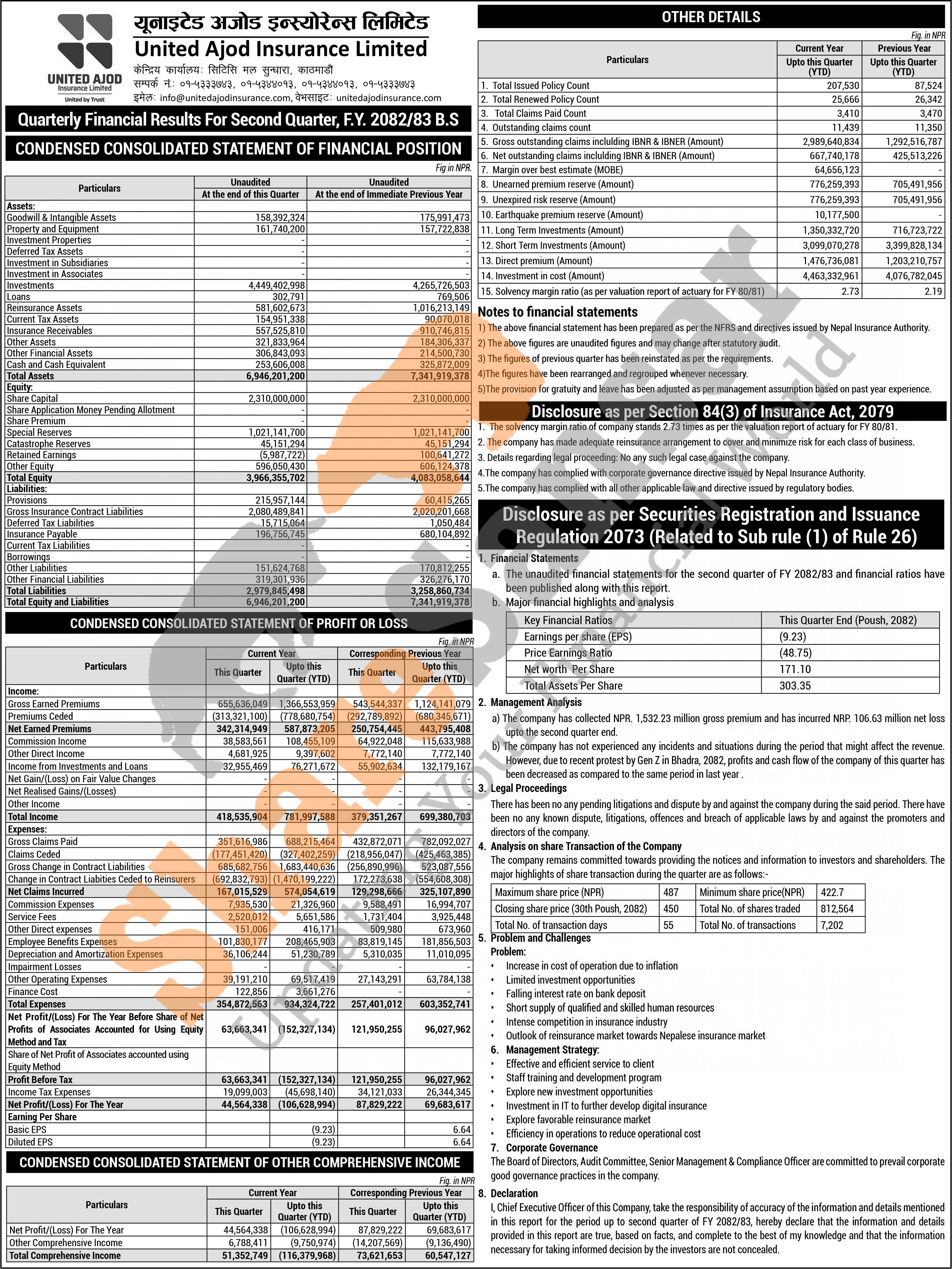 United Ajod Insurance Limited has posted a net loss of Rs 106.62 million and published its 2nd quarter company analysis of the fiscal year 2082/83.
