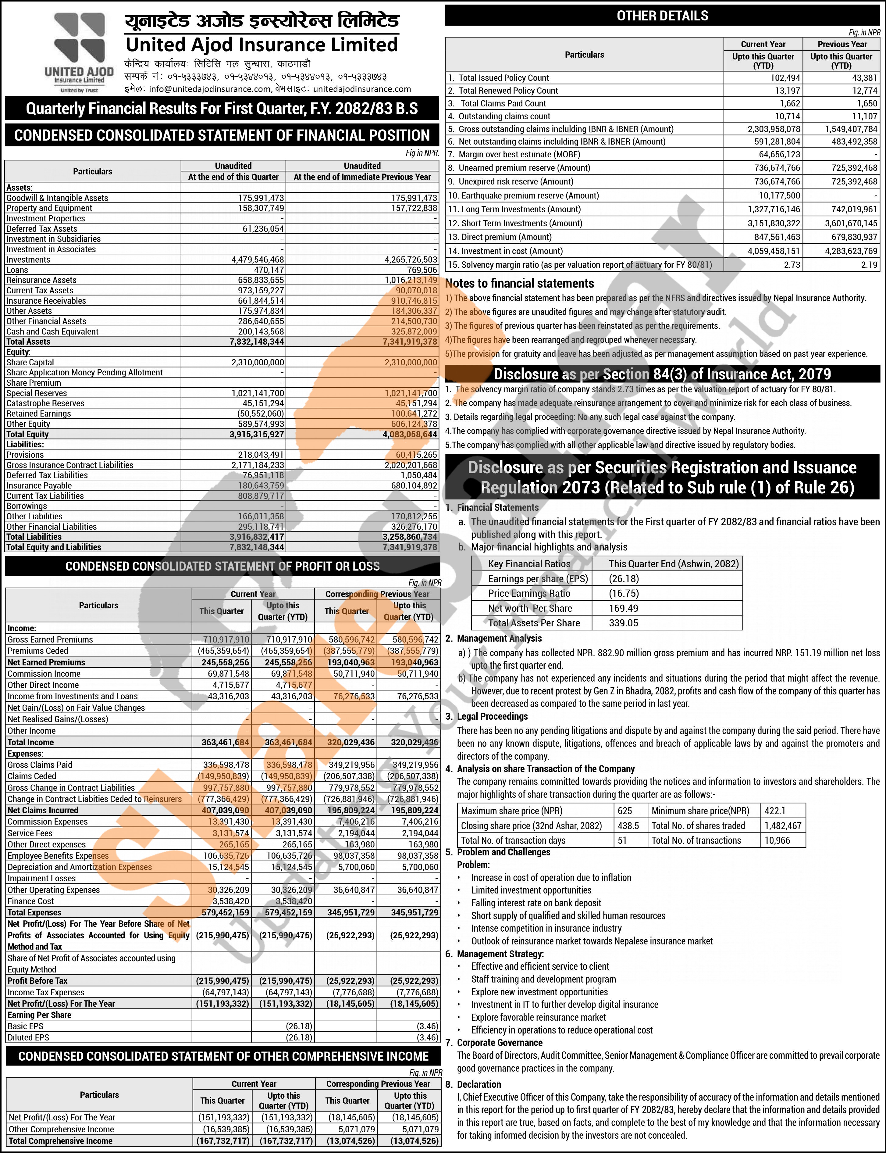 United Ajod Insurance Limited has posted a net loss of Rs 151.19 million and published its 1st quarter company analysis of the fiscal year 2082/83.