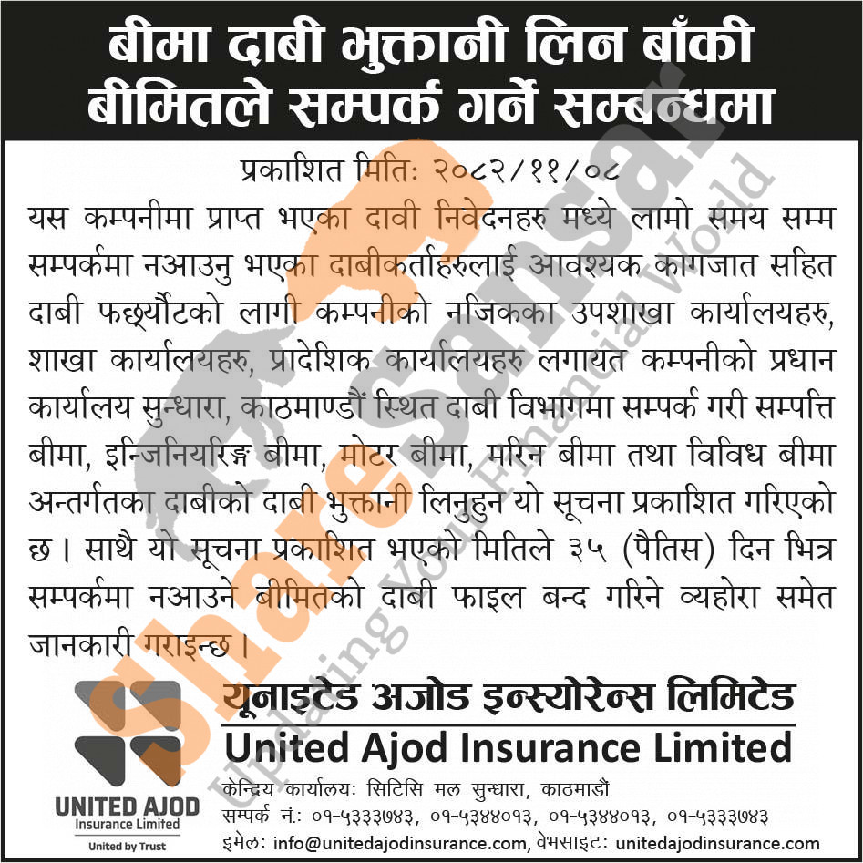 United Ajod Insurance Limited has published a notice to its respectable insured to claim over on insurance policy payment within the given period of time.