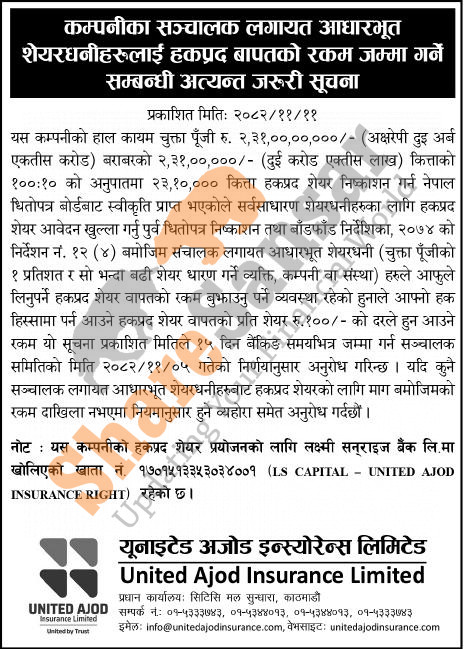 United Ajod Insurance Limited has urged its directors and basic shareholders to deposit 100:10 right share amount within a given period of time.