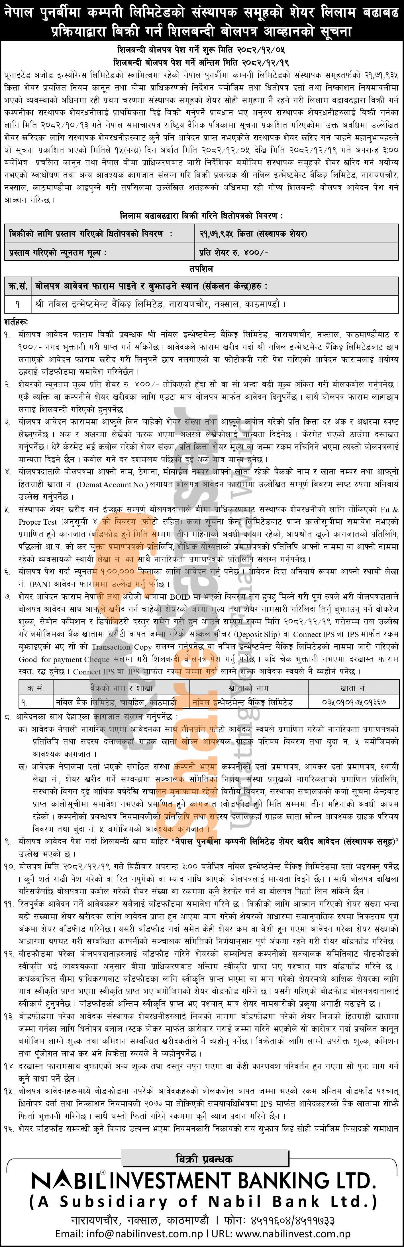 United Ajod Insurance Limited is selling 21,71,935 units promoter shares of Nepal Reinsurance Company Limited in an auction to the interested person from 5th Chaitra to 19th Chaitra, 2082.