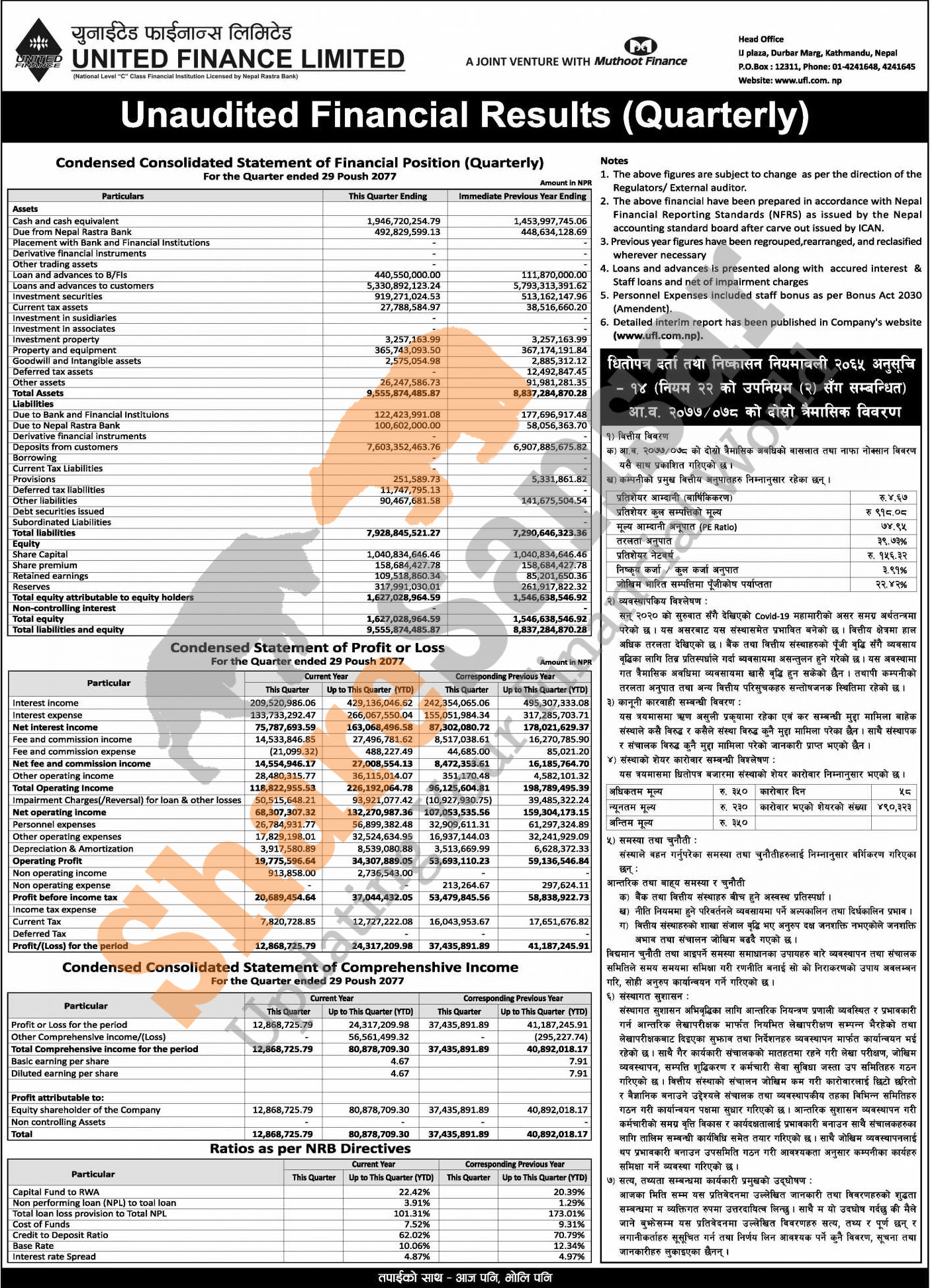 United Finance Limited has posted a net profit of Rs 24.31 million and published its 2nd quarter company analysis of the fiscal year 2077/78.