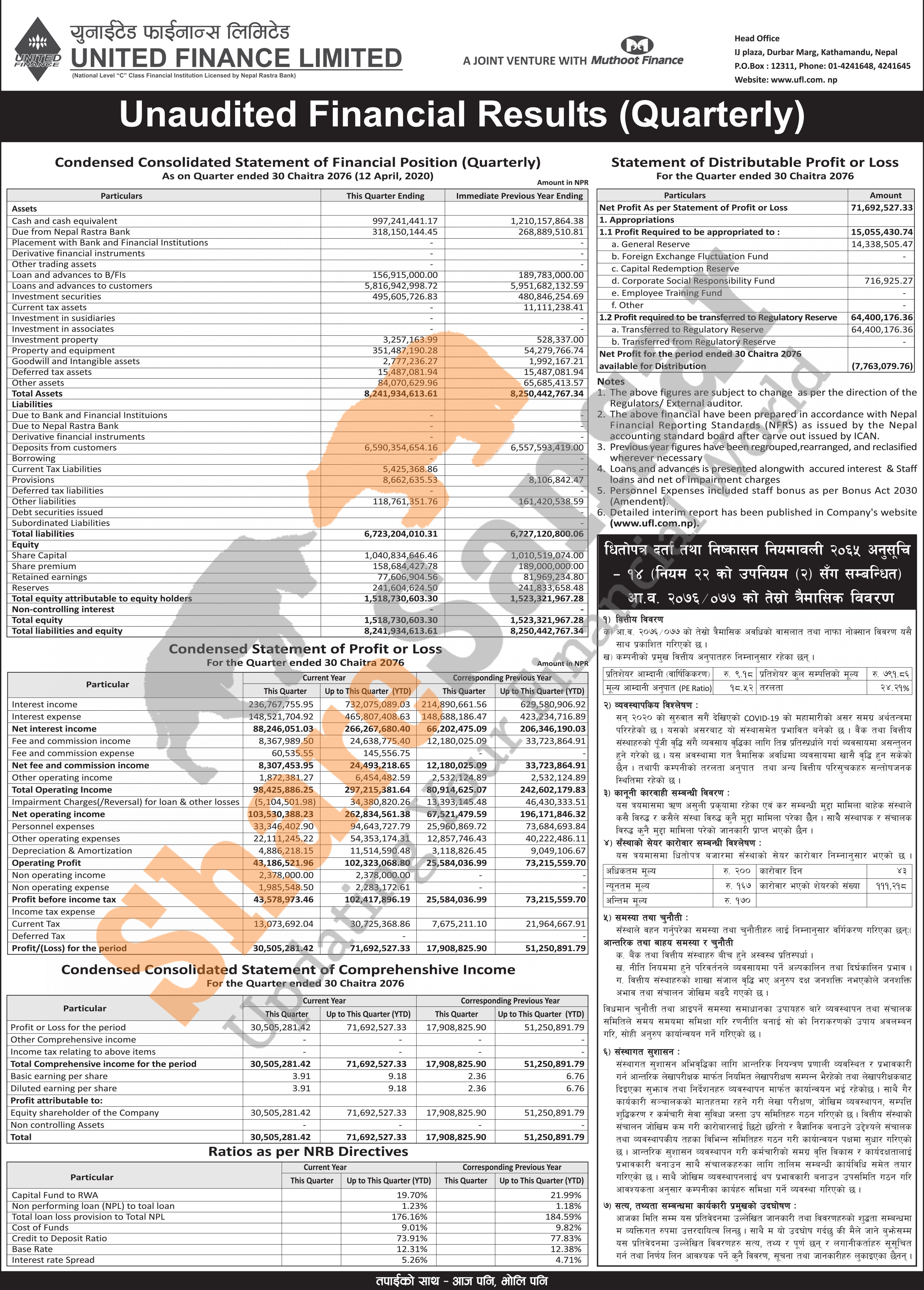 United Finance Limited has posted a net profit of Rs 71.69 million and published its 3rd quarter company analysis of the fiscal year 2076/77.