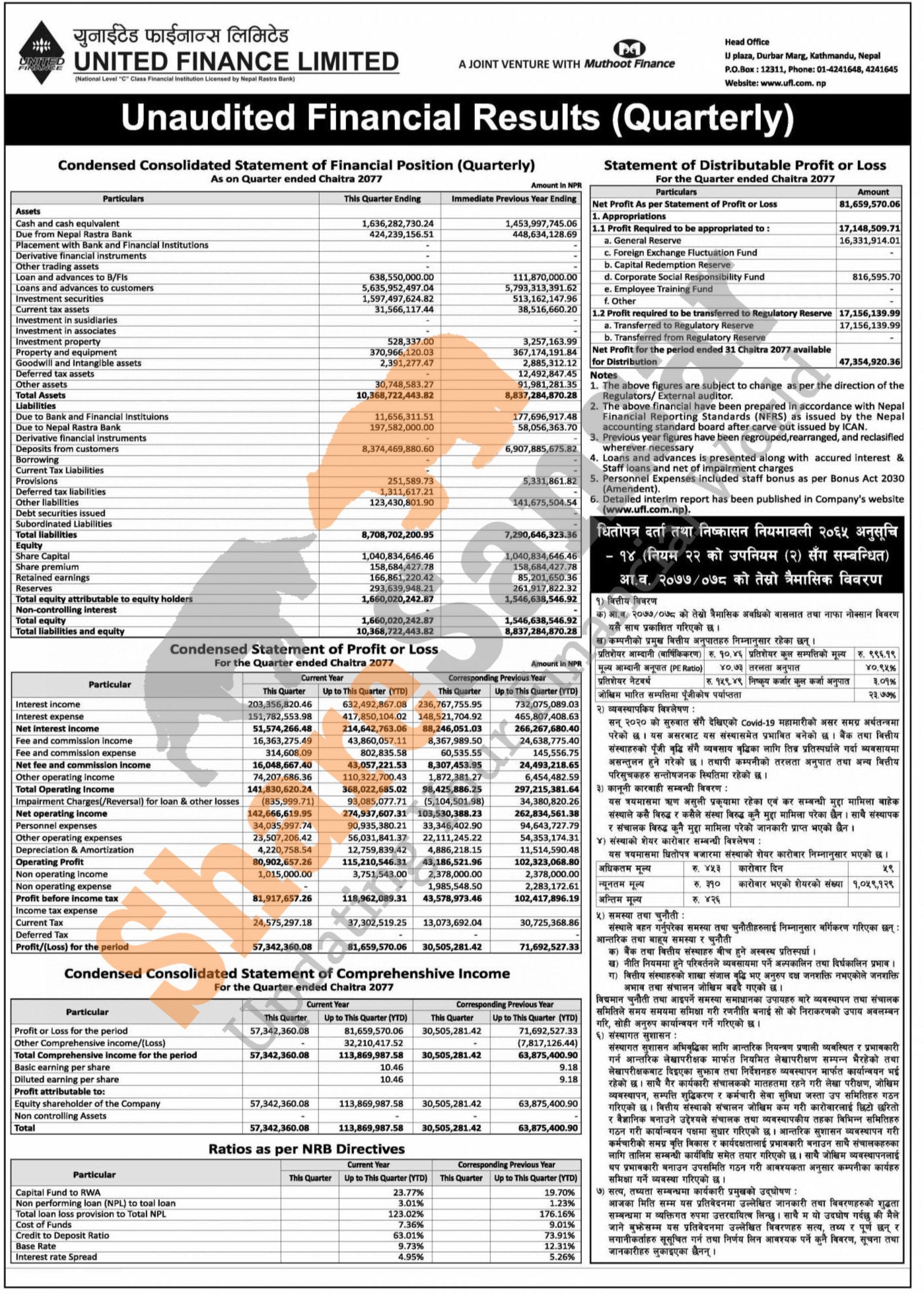 United Finance Limited has posted a net profit of Rs 81.65 million and published its 3rd quarter company analysis of the fiscal year 2077/78.