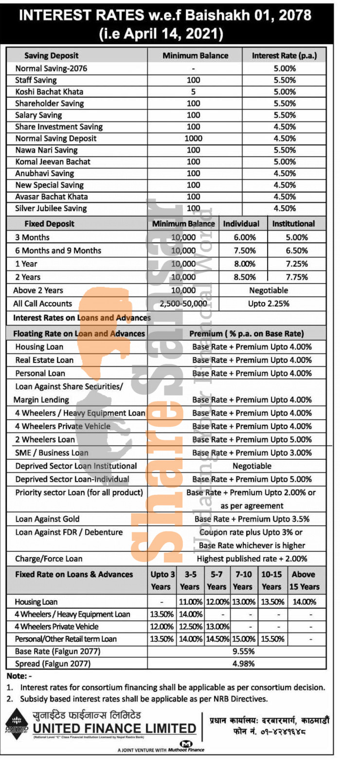 United Finance Limited has published a notice regarding the new interest rate for deposit and loan products and it's effective from 1st Baisakh, 2078.