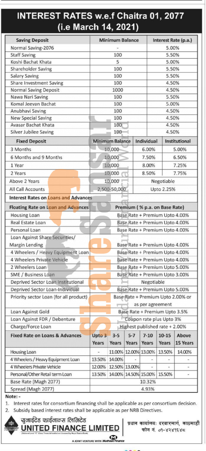 United Finance Limited has published a notice regarding the new interest rate for deposit and loan products and it's effective from 1st Chaitra, 2077.