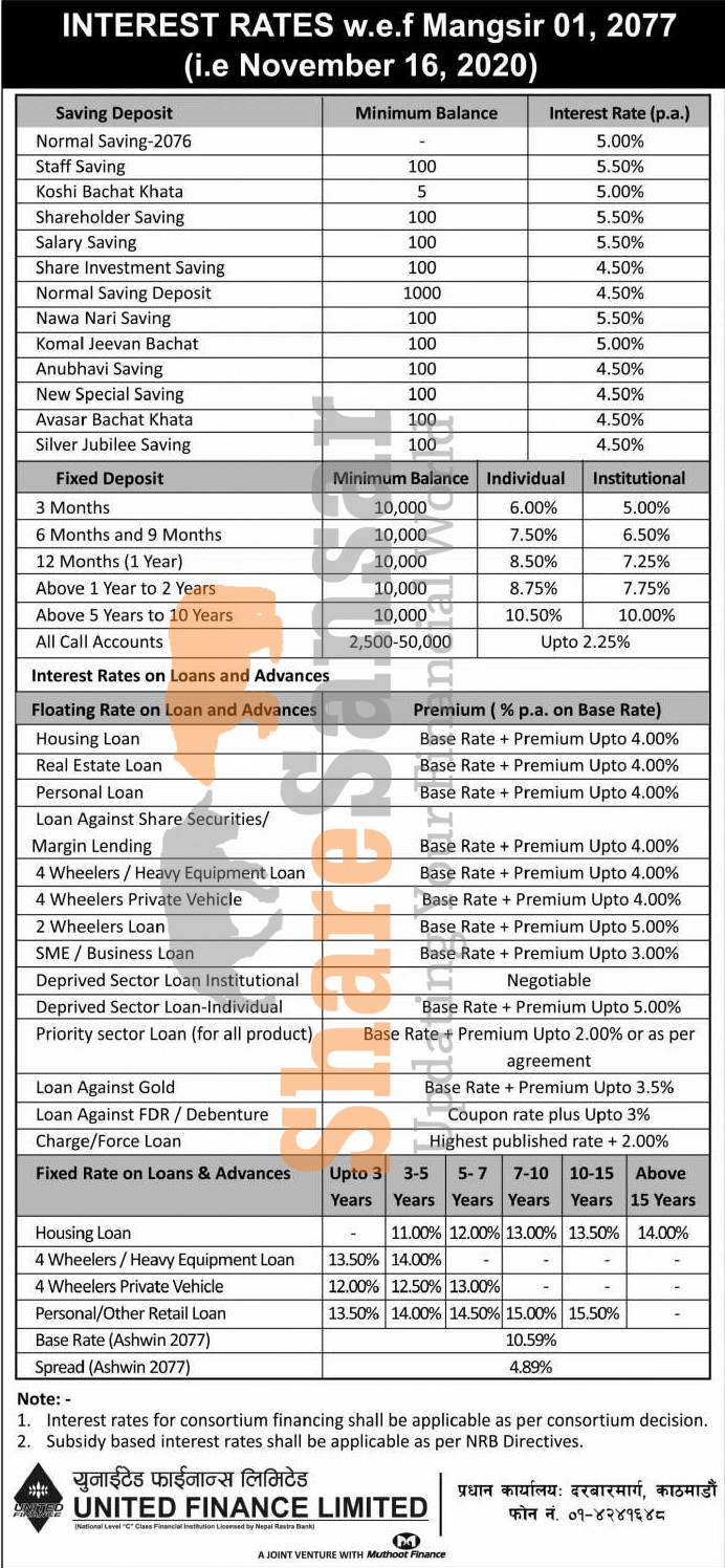 United Finance Limited has published a notice regarding the new interest rate for its deposit and loan products and it's effective from 1st Mangsir, 2077.