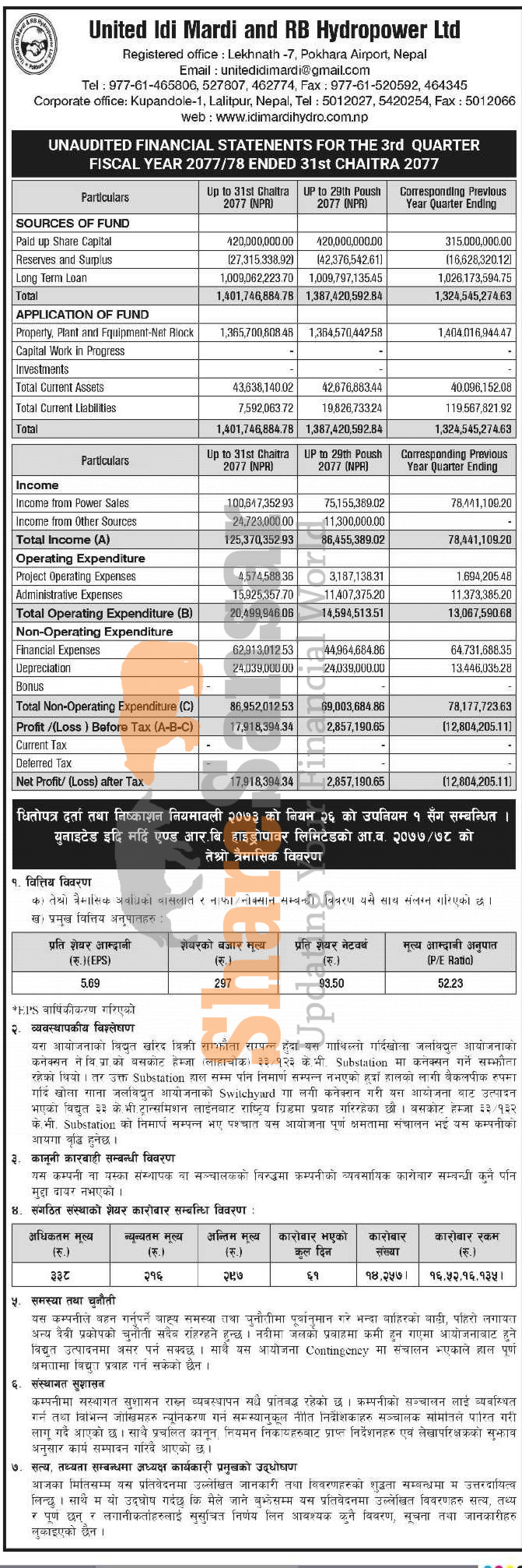 United IDI Mardi and RB Hydropower Company Limited has posted a net profit of Rs 17.91 million and published its 3rd quarter company analysis of the fiscal year 2077/78.