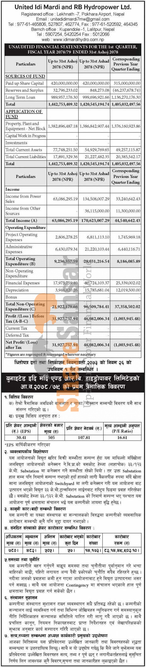 United IDI Mardi and RB Hydropower Company Limited has posted a net profit of Rs 31.92 million and published its 1st quarter company analysis of the fiscal year 2078/79.
