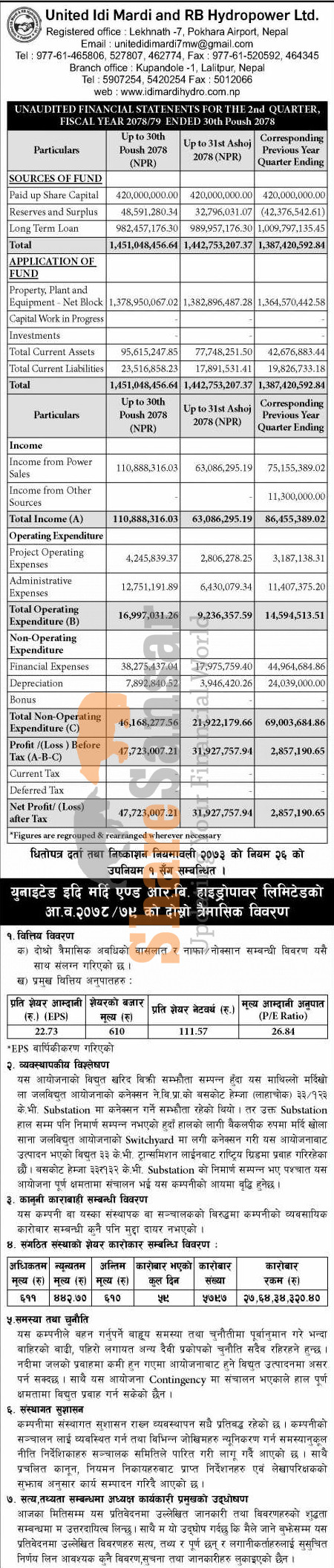 United IDI Mardi and RB Hydropower Company Limited has posted a net profit of Rs 47.72 million and published its 2nd quarter company analysis of the fiscal year 2078/79.