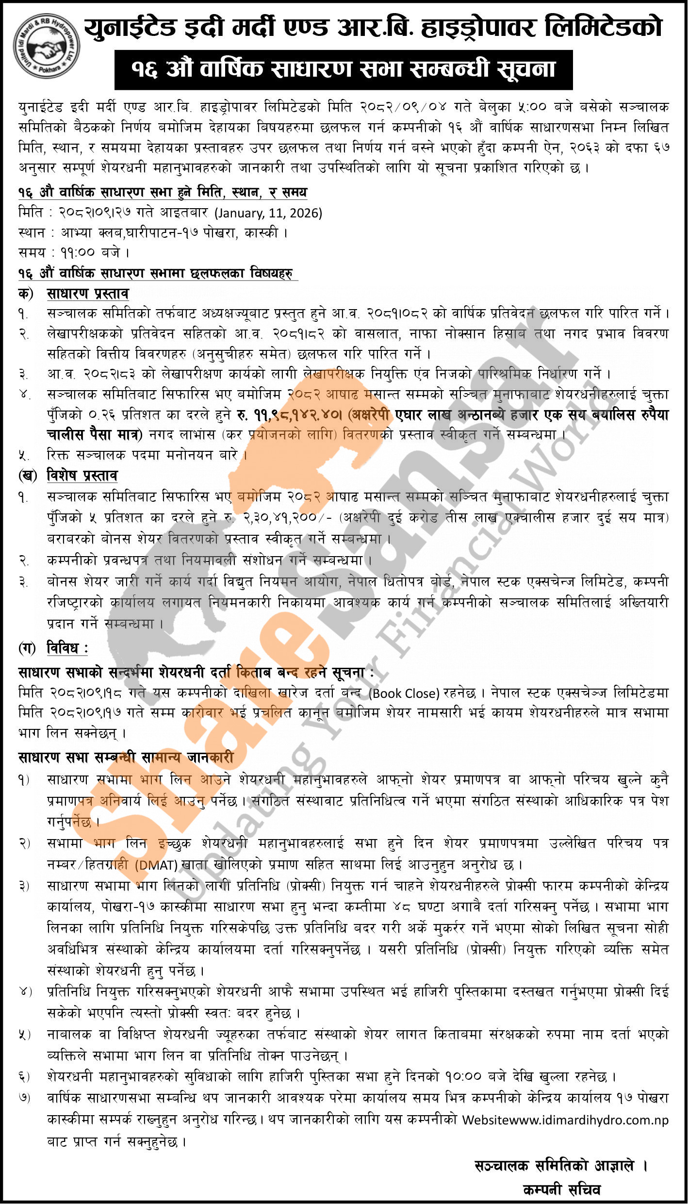 United Idi-Mardi and R.B. Hydropower Limited has announced its 16th AGM going to be held on 27th Poush, 2082.