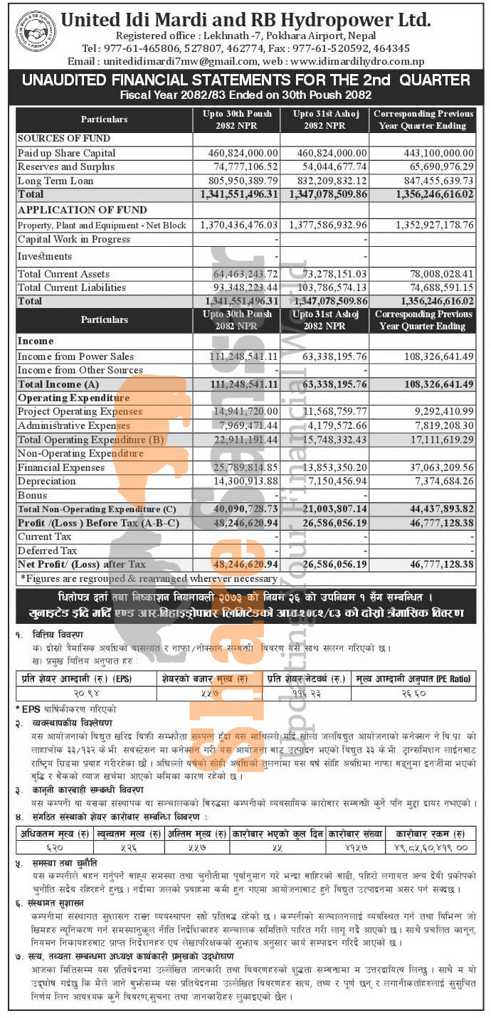 United Idi-Mardi and R.B. Hydropower Limited has posted a net profit of Rs 48.24 million and published its 2nd quarter company analysis of the fiscal year 2082/83.