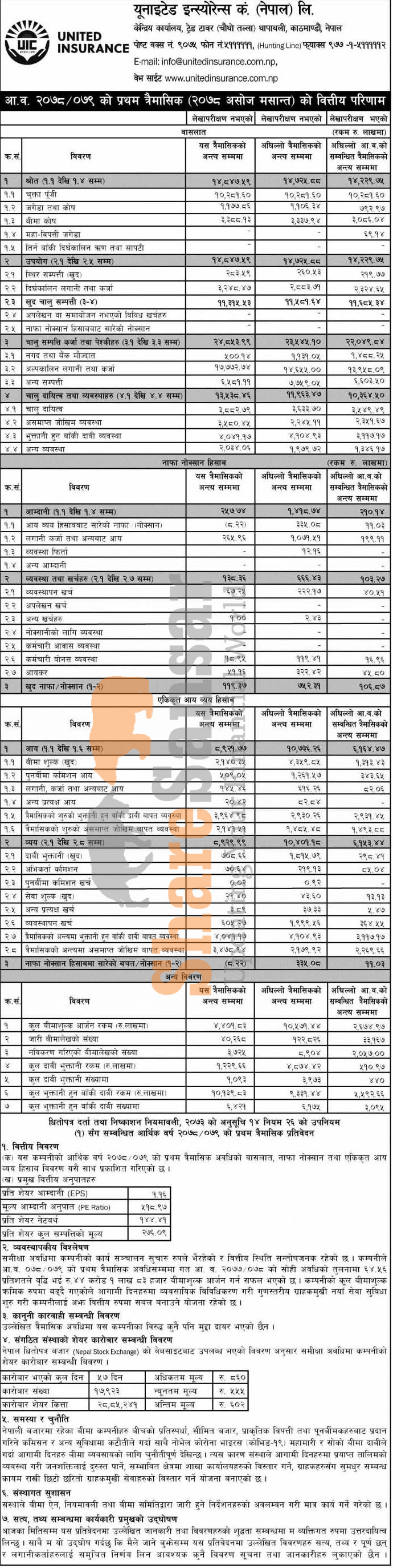 United Insurance Company Limited has posted a net profit of Rs 11.93 million and published its 1st quarter company analysis of the fiscal year 2078/79.