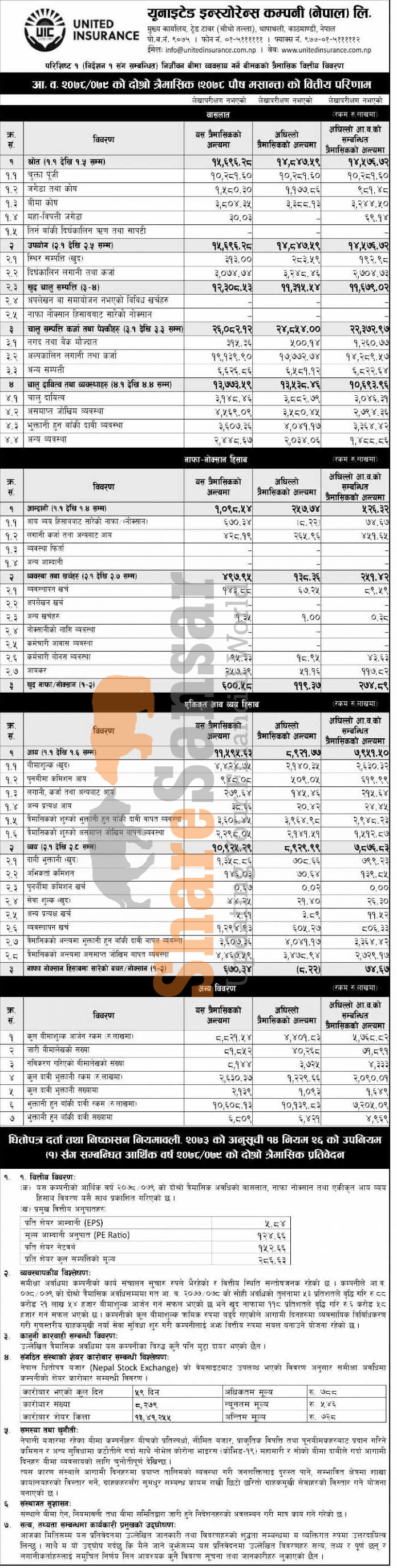 United Insurance Company Limited has posted a net profit of Rs 60.05 million and published its 2nd quarter company analysis of the fiscal year 2078/79.