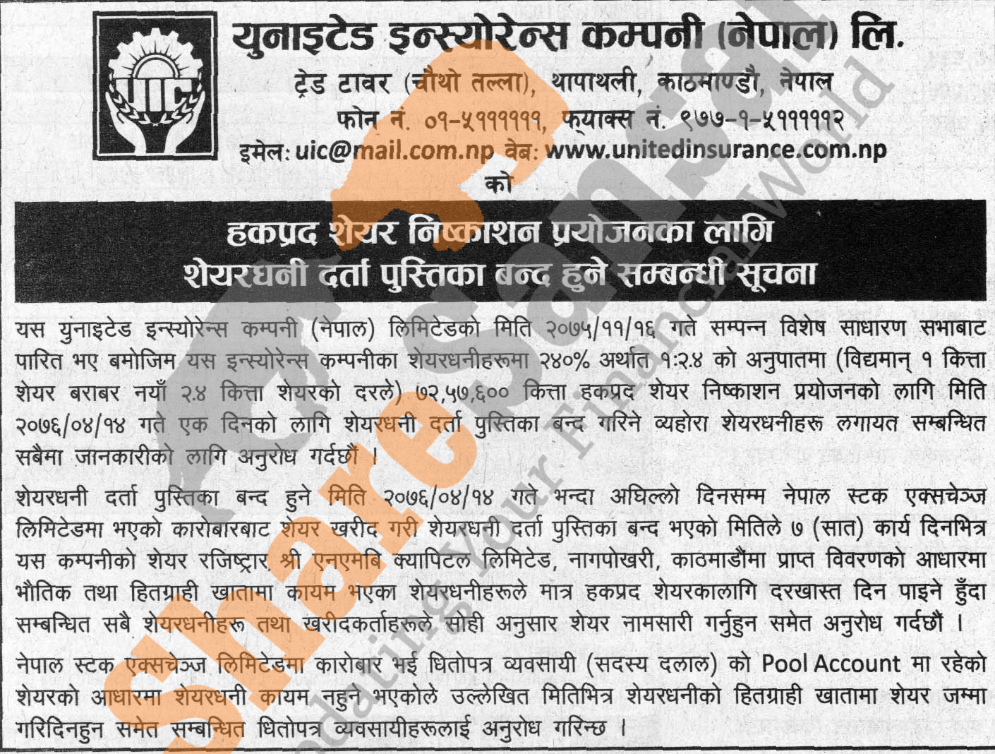 United Insurance Company (Nepal) Limited has announced a book closure date for its upcoming 1:2.4 ratio right share on 14th Shrawan, 2076.