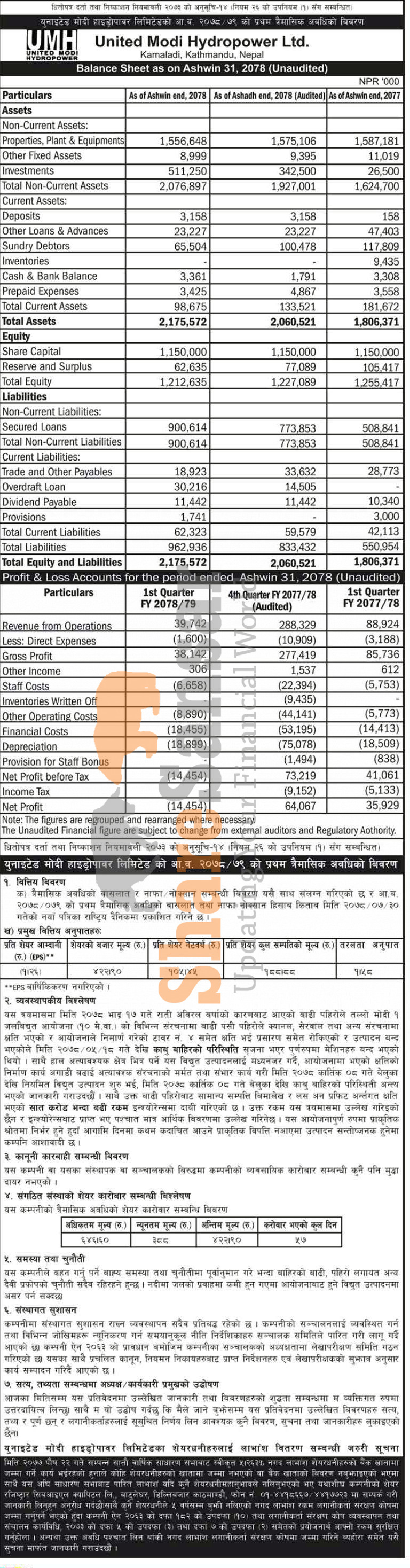 United Modi Hydropower Limited has posted a net loss of Rs 14.45 million and published its 1st quarter company analysis of the fiscal year 2078/79.