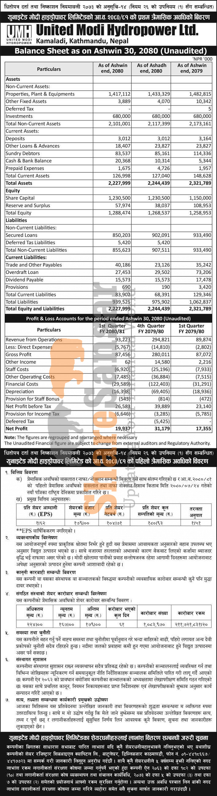 United Modi Hydropower Limited has posted a net profit of Rs 19.93 million and published its 1st quarter company analysis of the fiscal year 2080/81.