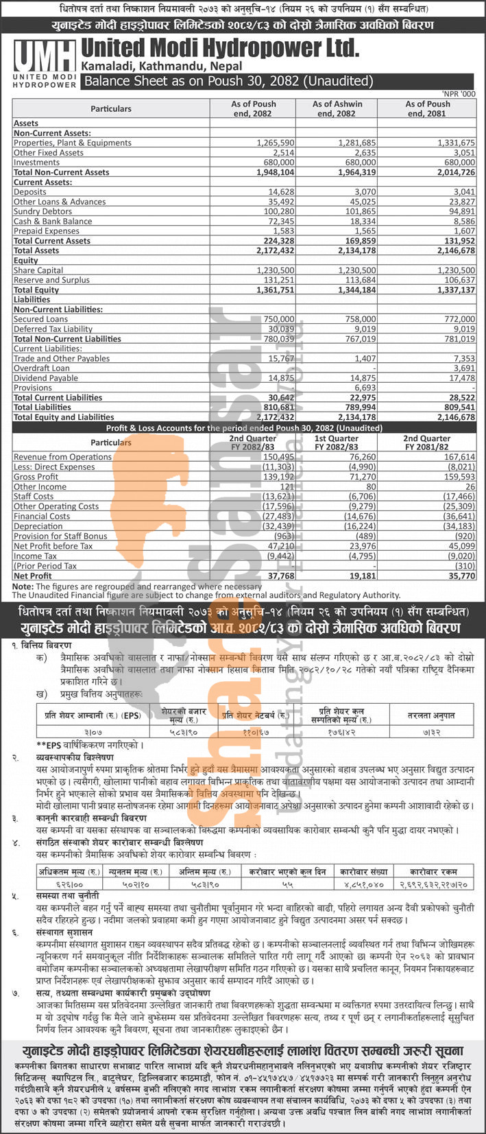 United Modi Hydropower Limited has posted a net profit of Rs 37.76 million and published its 2nd quarter company analysis of the fiscal year 2082/83.