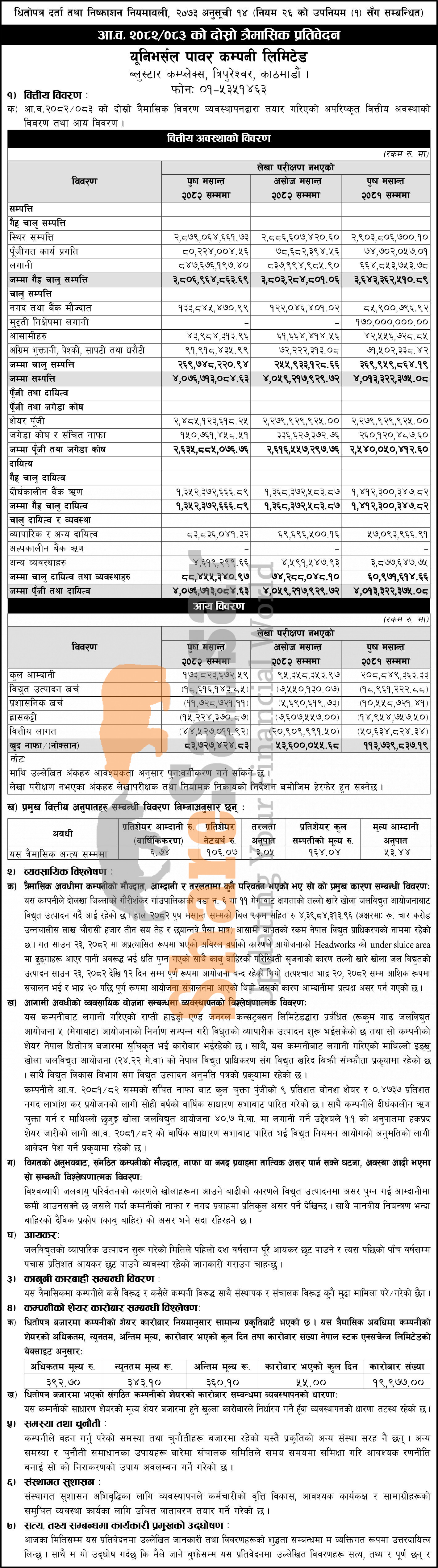 Universal Power Company Limited has posted a net profit of Rs 83.72 million and published its 2nd quarter company analysis of the fiscal year 2082/83.