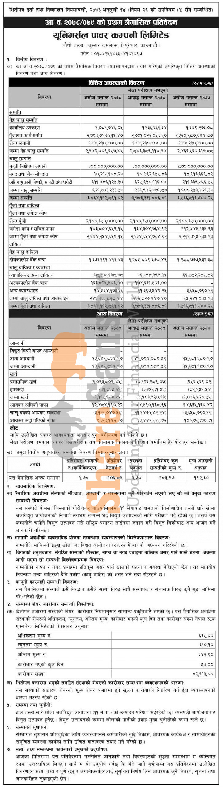 Universal Power Company Limited has posted a net profit of Rs 9.36 million and published its 1st quarter company analysis of the fiscal year 2078/79.