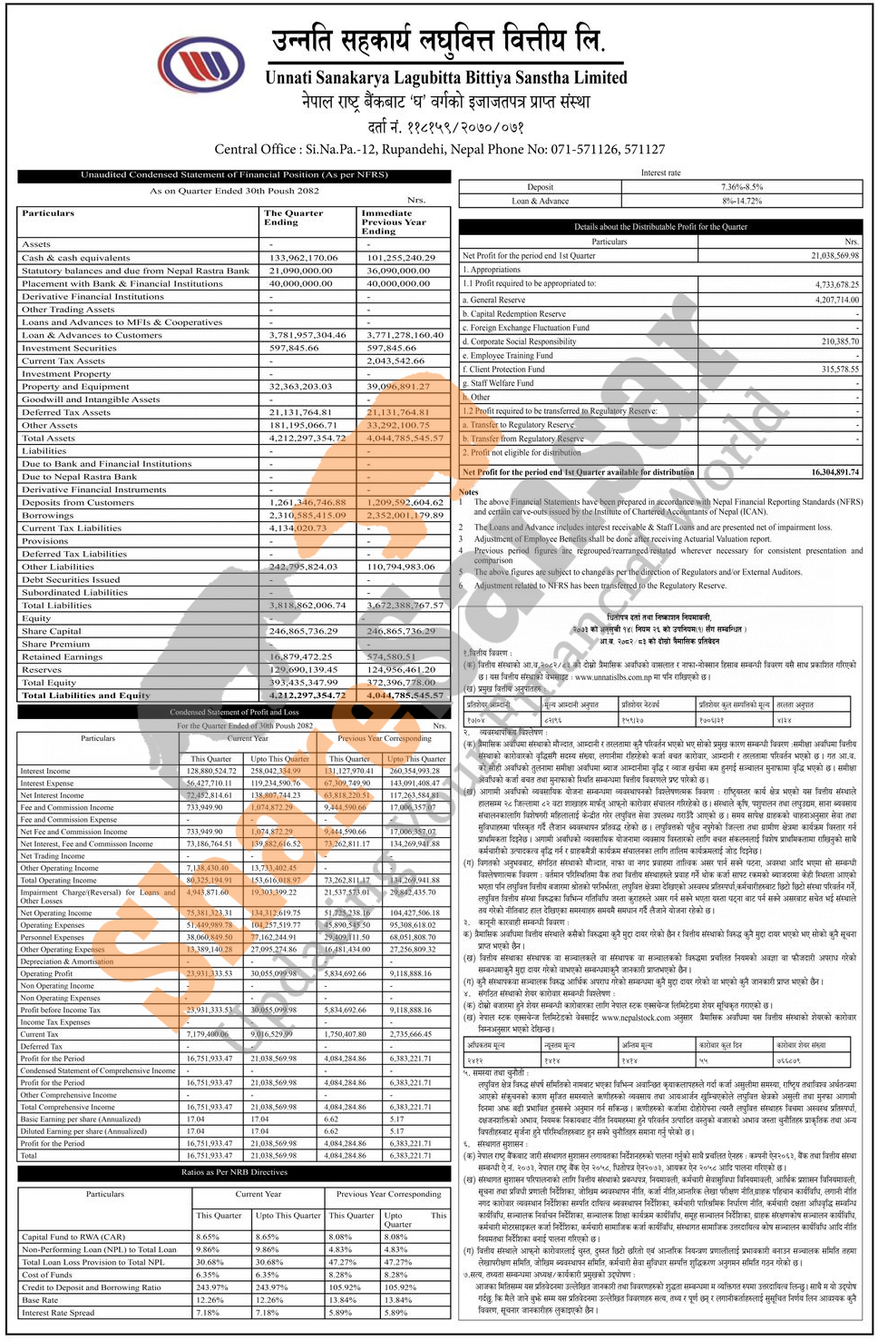 Unnati Sahakarya Laghubitta Bittiya Sanstha Limited has posted a net profit of Rs 21.03 million and published its 2nd quarter company analysis of the fiscal year 2082/83.