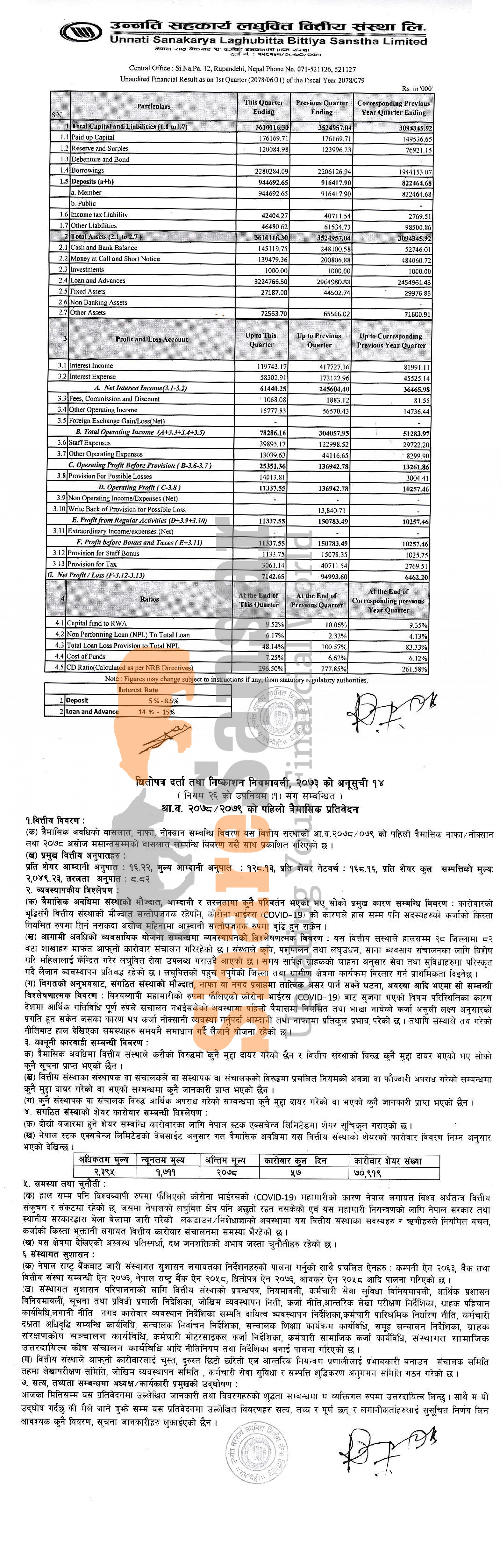 Unnati Sahakarya Laghubitta Bittiya Sanstha Limited has posted a net profit of Rs 7.14 million and published its 1st quarter company analysis of the fiscal year 2078/79.