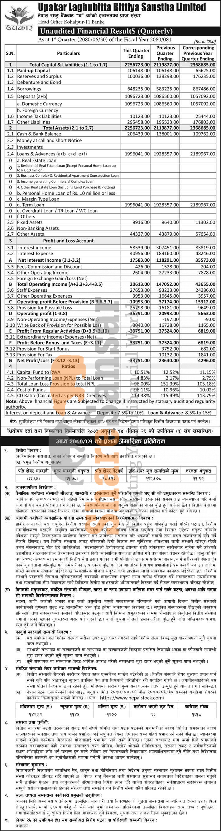 Upakar Laghubitta Bittiya Sanstha Limited has posted a net loss of Rs 33.75 million during the 1st quarter of the fiscal year 2080/81.