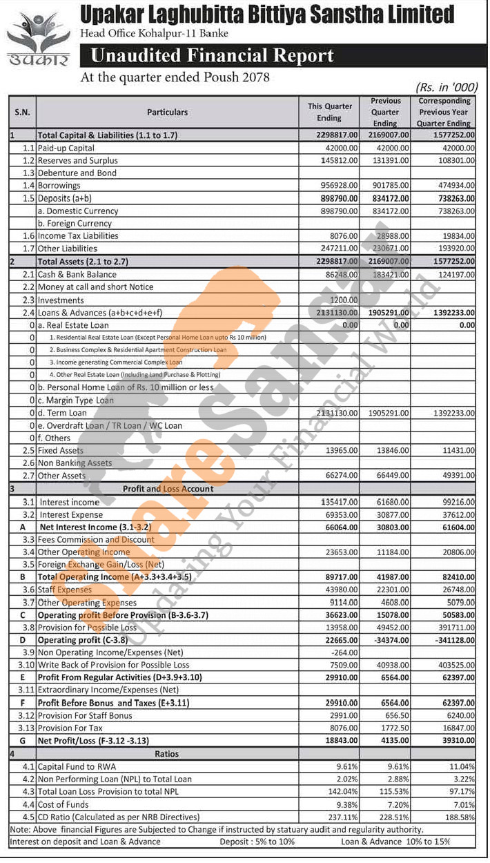Upakar Laghubitta Bittiya Sanstha Limited has posted a net profit of Rs 18.84 million and published its 2nd quarter company analysis of the fiscal year 2078/79.