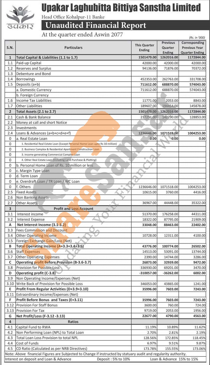 Upakar Laghubitta Bittiya Sanstha Limited has posted a net profit of Rs 22.67 million during the 1st quarter of the fiscal year 2077/78.