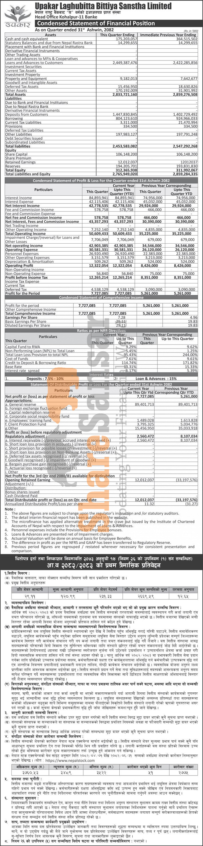 Upakar Laghubitta Bittiya Sanstha Limited has posted a net profit of Rs 7.72 million and published its 1st quarter company analysis of the fiscal year 2082/83.